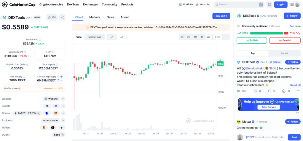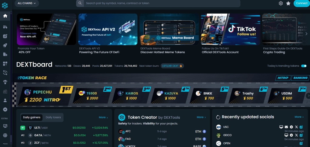 Dextools.io is a powerful platform that allows users to analyze tokens traded on decentralized exchanges (DEXs). It supports Uniswap, PancakeSwap, SushiSwap, and more. With real-time data on liquidity, trading volume, holders, and transactions, it has become an essential tool for navigating the DeFi space safely.